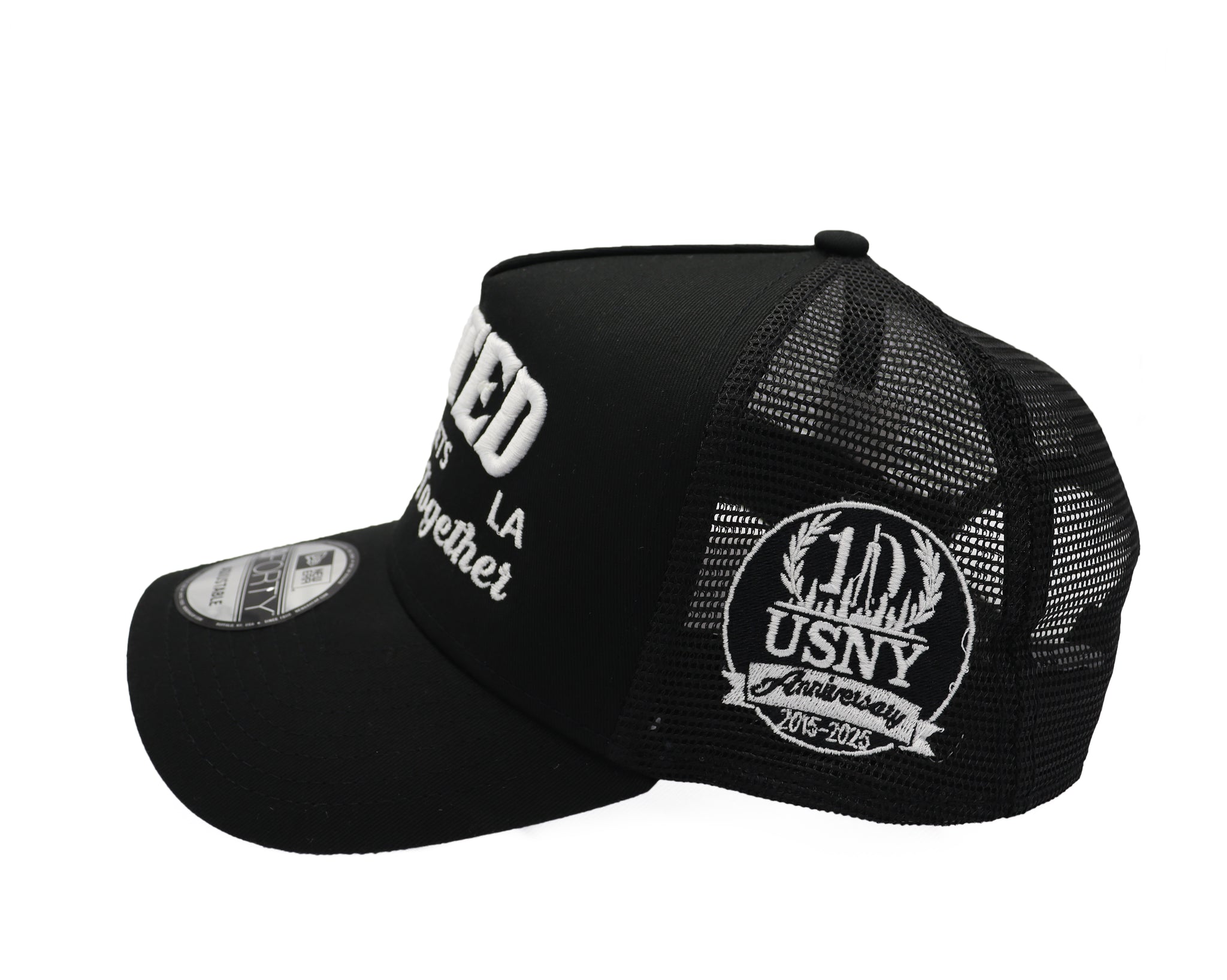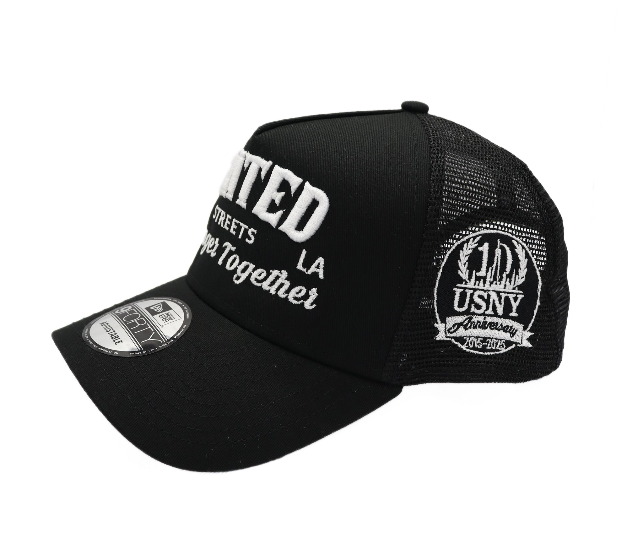 NEW ERA TRUCKER HAT WITH UNITED STREETS - STRONGER TOGETHER LOGO DETAILING, CURVED BRIM, AND SNAPBACK FASTENING. 10 YEAR ANNIVERSARY LOGO PATCH EMBROIDERED ON SIDE OF HAT